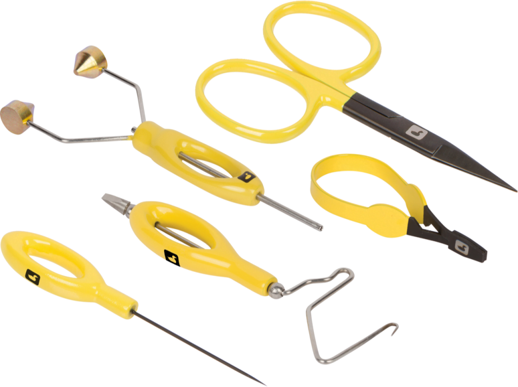 Packaged in a heavy duty travel case and featuring the Ergo All Purpose Scissors, Ergo All Purpose Bobbin, Ergo Bodkin, Ergo Whip Finisher, and Ergo Hackle Plier this is an excellent choice as a gift for the first-time tyer, or the long-time tyer who wants to trick out his or her bench with something new.
